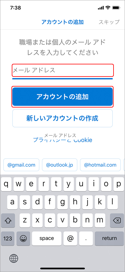 アカウントの追加画面が表示されますので、「メールアドレス」を入力し、「アカウントの追加」をタップします。