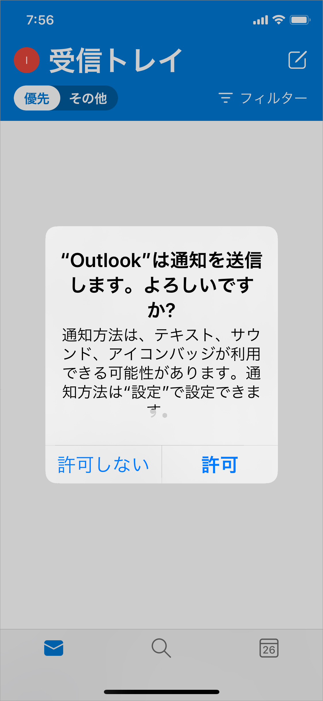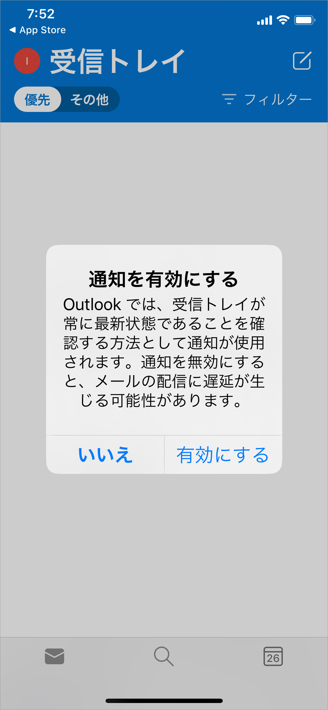 「通知を有効にする」とすると、新しいメッセージが届いたときに、その都度iPhoneの画面に通知されます。「いいえ」とすると、Outlookを起動したときに、メッセージを受信します。