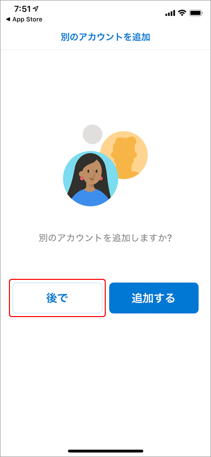 「別のアカウントを追加」の画面が表示されますので、「後で」ボタンをタップします。