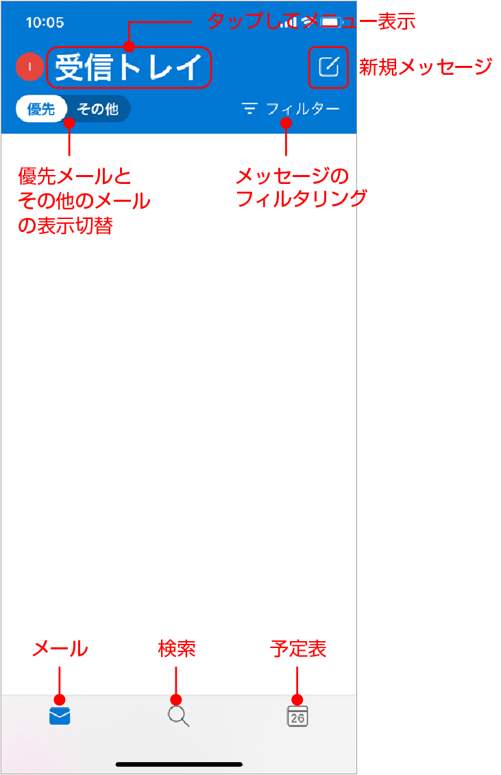- 画面下の「メール」「検索」「予定表」でそれぞれの画面に切り換えられます。