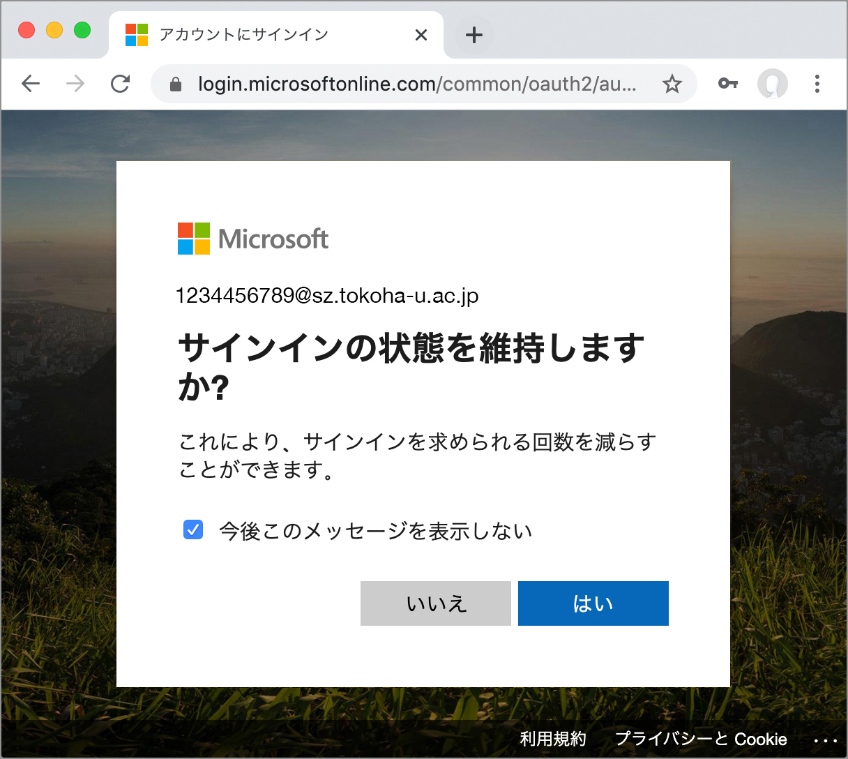 自宅などでのパソコンで利用する場合は、サインイン回数を減らすために「はい」のボタンをクリックします。「はい」を選択すると、2回目以降のサインインでユーザーIDとパスワードの入力が省略されます。