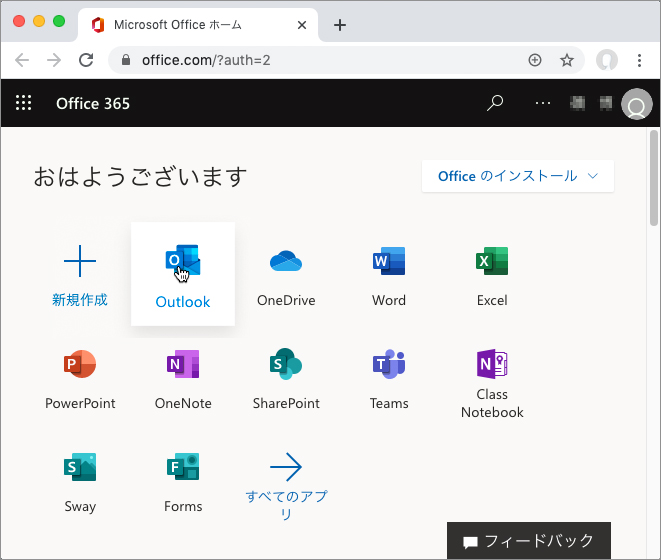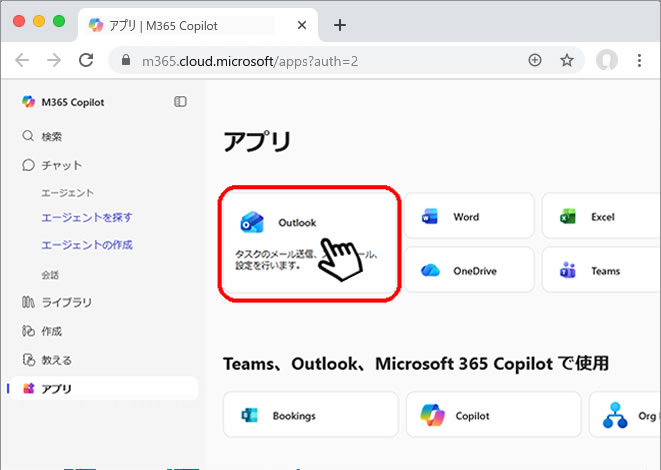 Microsoft 365にサインインし、利用できるツールの一覧の中から「Outlook」を選びます。