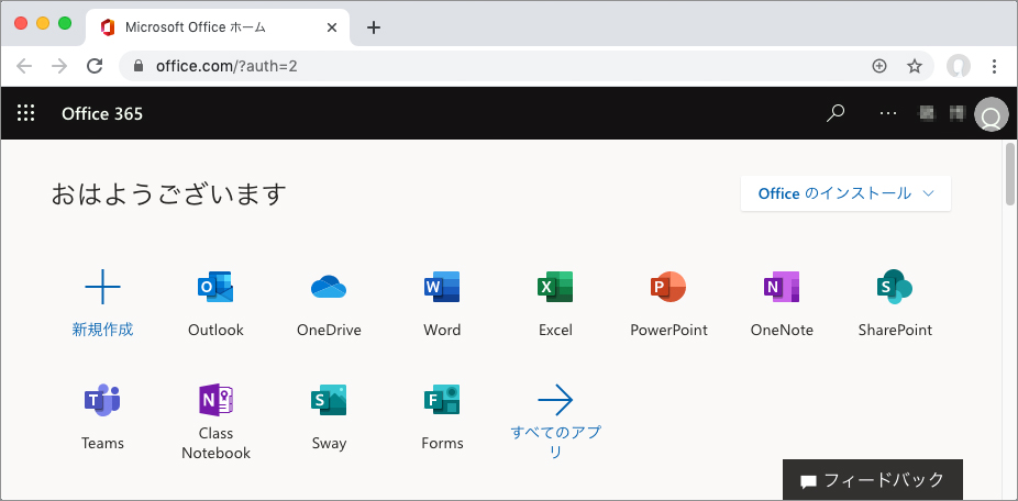 下の画面が表示され、Microsoft 365の利用が可能となります。