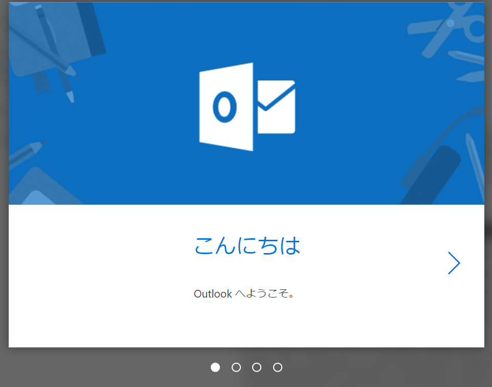 はじめてOutlookを起動した場合、初期設定のウィザードが起動しますので、右にある矢印