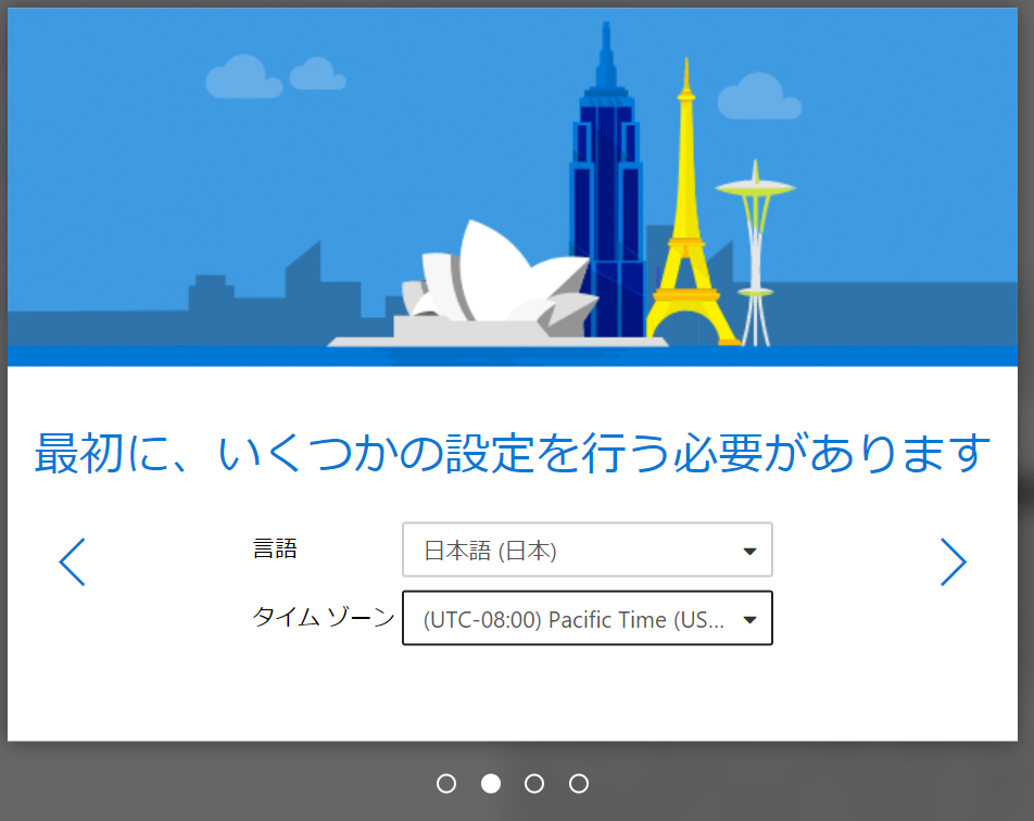 言語を「日本語(日本)」に、タイムゾーンを「(UTC+09:00)Osaka、Sapporo、Tokyo」を設定し、右にある矢印