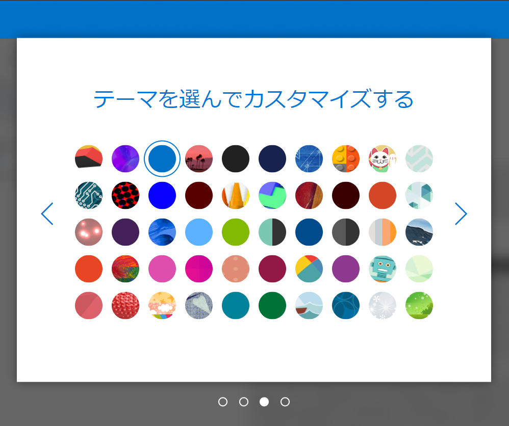 テーマとは、Outlookの画面の背景の概観のことです。一覧から自分の好みのテーマを選択し、右にある矢印