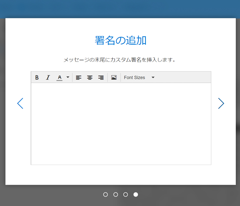 署名とは、メールメッセージの末尾に挿入する送信者の氏名や連絡先などを数行にまとめたものです。署名の編集については、「Outlook」のページで説明しています。ここでは、後から編集することにして、右にある矢印