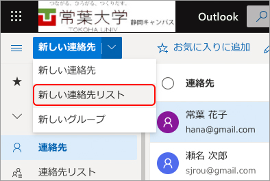 ① 「新しい連絡先」ボタンから「新しい連絡先リスト」を選ぶ