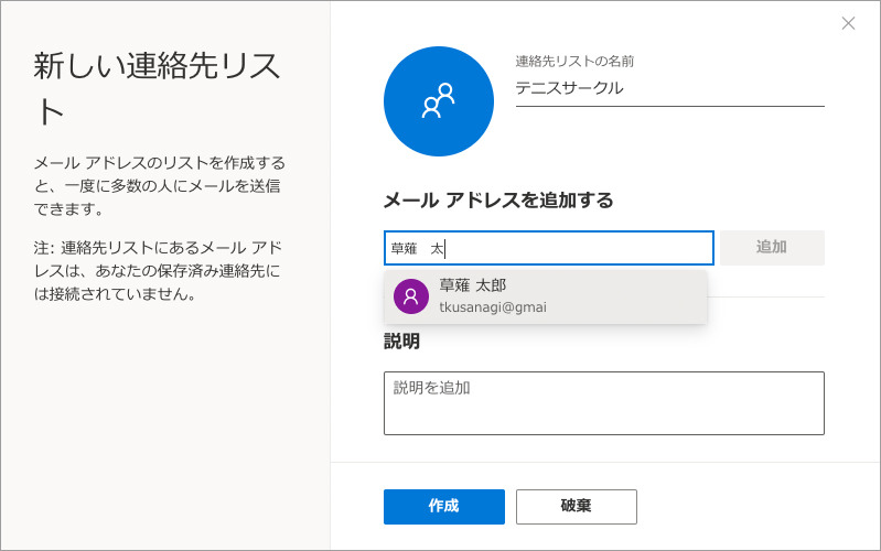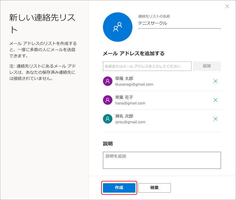 新しい連絡先リストの入力画面が表示されますので、「連絡先リストの名前」を入力し、その連絡先リストに含めるメールアドレスを追加します。必要に応じて「説明」も入力します。