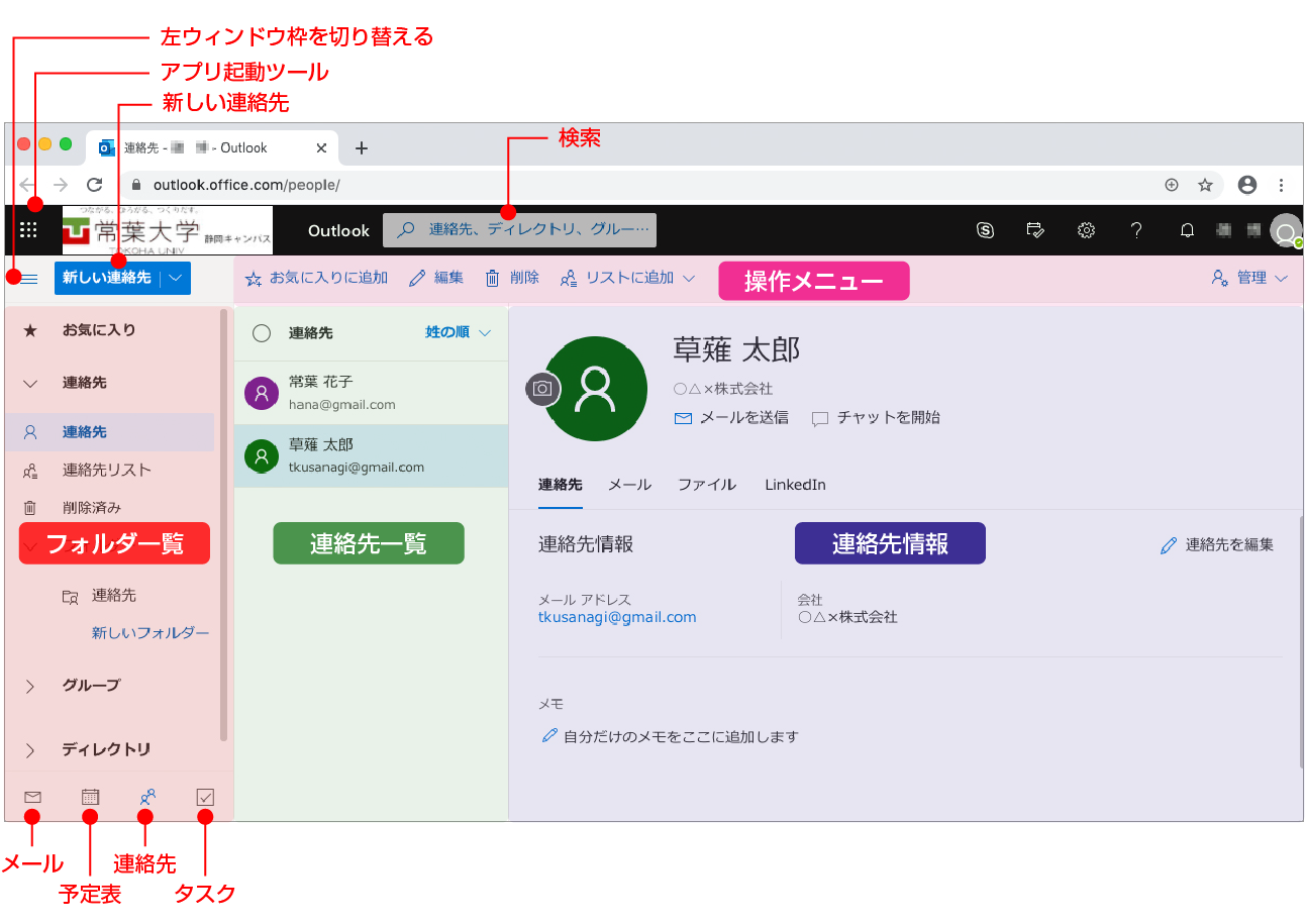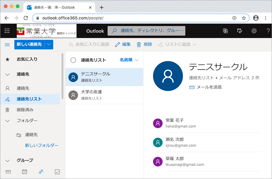 ※ ドメイン名とは、メールアドレスの内@から後ろの部分を指します。常葉大学では、ドメイン名は静岡キャンパス、短大部、浜松キャンパス毎に異なります。つまり、グローバルアドレス帳には、自分の属するキャンパスの全ての学生、教員、事務職員が含まれますが、他のキャンパスのユーザーは含まれません。