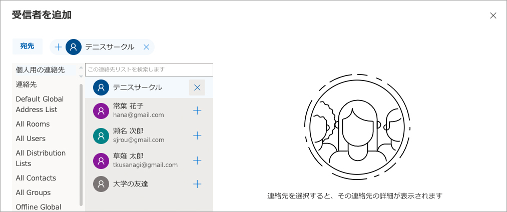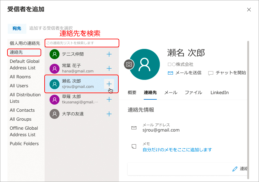 連絡先一覧の上部の検索欄にキーワード(氏名の一部もしくはメールアドレスの一部)を入れれば、候補が表示され、その中から追加することができます。「All Users」から選ぶときは、検索して追加するのがよいでしょう。