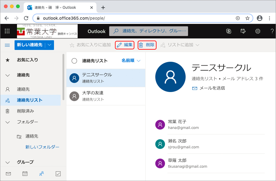 連絡先リストを編集するには、連絡先の画面で編集したい連絡先を選び、「操作メニュー」の「編集」ボタンをクリックします。連絡先リストを削除するには、「削除」ボタンをクリックします。