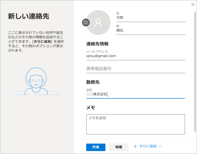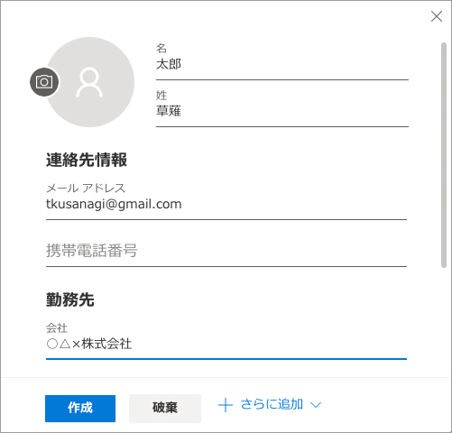 下の「作成」ボタンをクリックすれば、入力したユーザー情報が連絡先に追加されます。