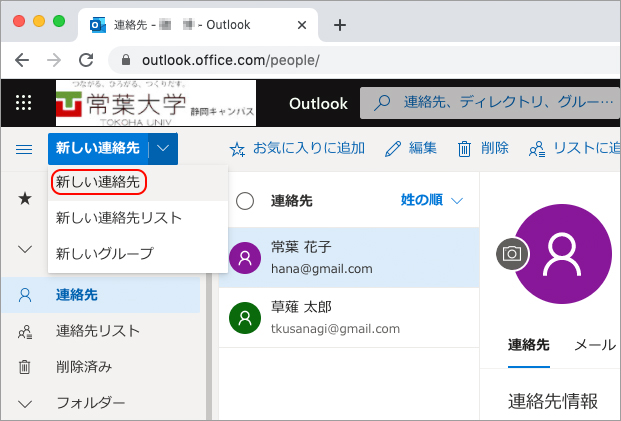 画面の左上の「新しい連絡先」ボタンをクリックし、表示されたメニューから「新しい連絡先」を選びます。