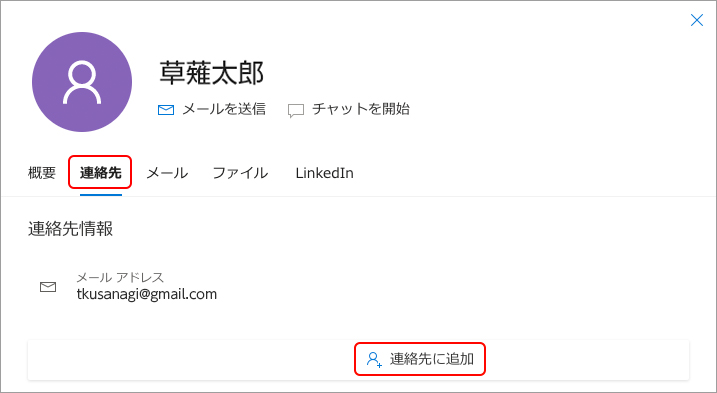 選択した連絡先の氏名やメールアドレスなどの情報が表示されます。