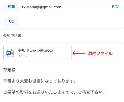 - Carbon Copyの略で、メールを参考に送る人のアドレスです。返信を求めてはおらず、情報を共有しておきたい相手などをCCに指定します。