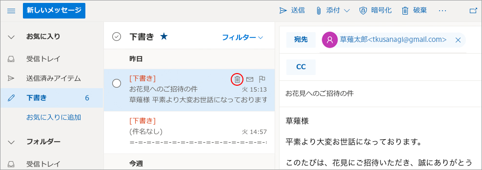 下書きを削除するには、「下書き」フォルダの下書きにマウスを重ね、右側に表示された「ゴミ箱」のボタン
