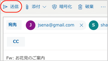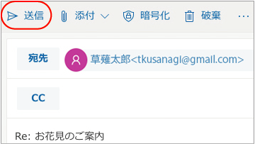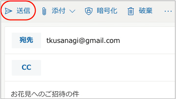 メール作成画面の左上にある「送信」ボタンをクリックします。