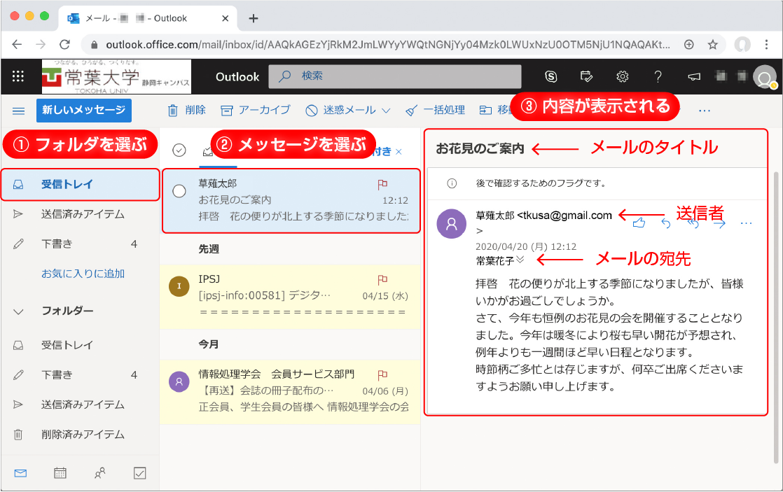 - 受信したメールは、メールの振り分けなどが設定されていない場合は、受信トレイに入ります。