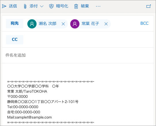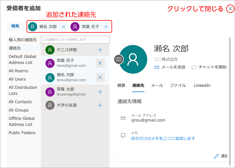 複数の連絡先を宛先にする場合は、上記操作を繰り返して連絡先を追加していきます。