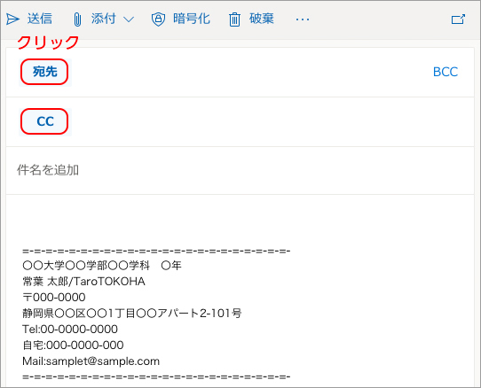 新しいメッセージの画面で、「宛先」もしくは「CC」もしくは「BCC」の部分をクリックします。