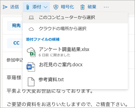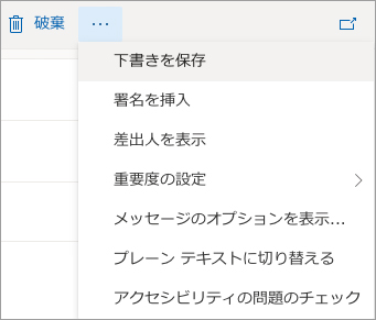 メールを送信しなかった場合は、入力した内容は自動的に「下書き」フォルダに保存されます。また、入力中に下書きを保存する場合は、「操作メニュー」の右端にある「...」のメニューから「下書きを保存」を選びます。