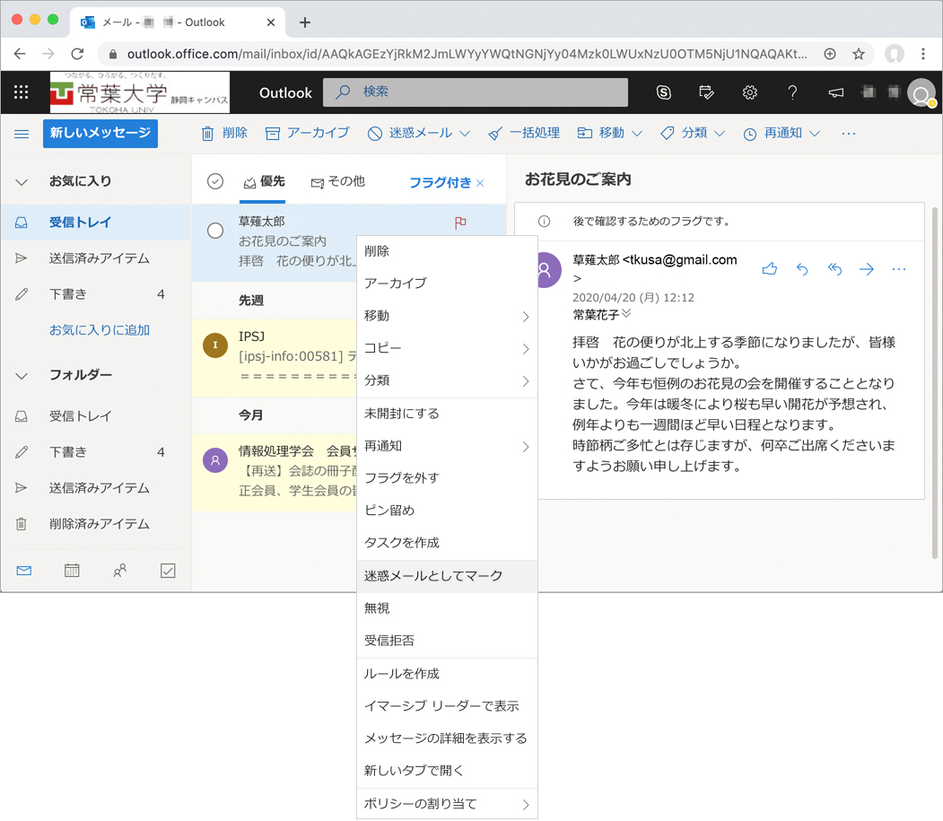 | 迷惑メール | 選択したメールメッセージを迷惑メールフォルダに移動します。 |