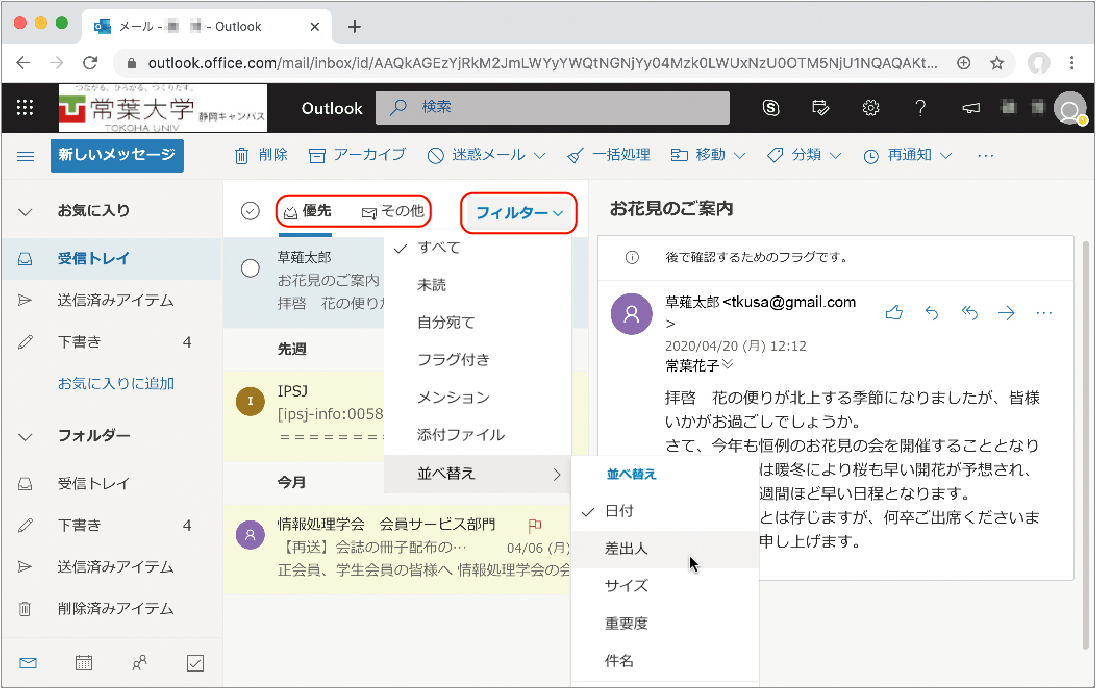 「メッセージ一覧」の上にある「フィルター」を使えば、特定のメールメッセージのみ表示したり(フィルタリング)、表示される順番を変更することができます。