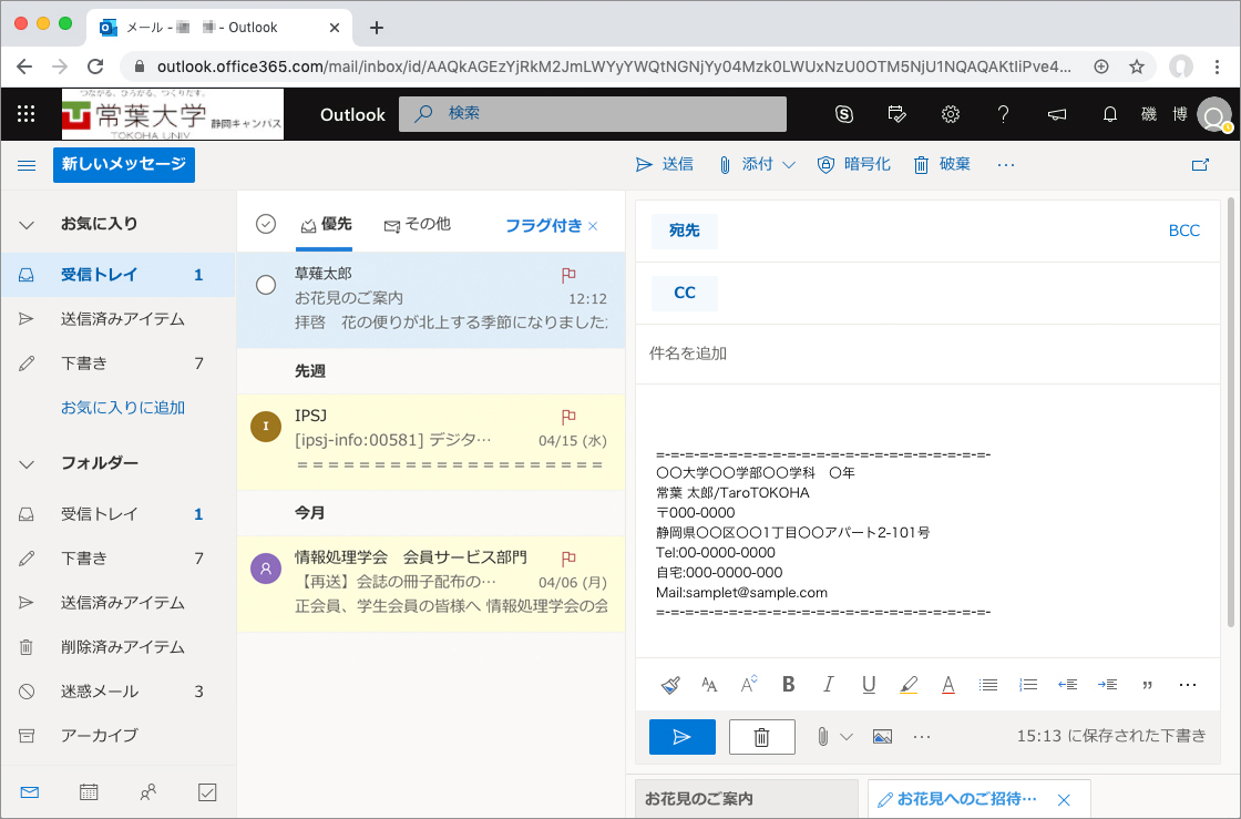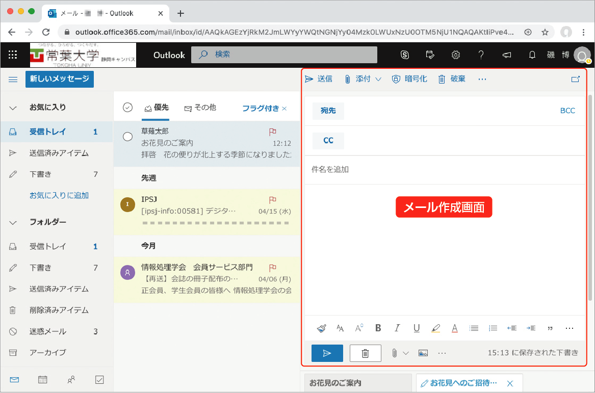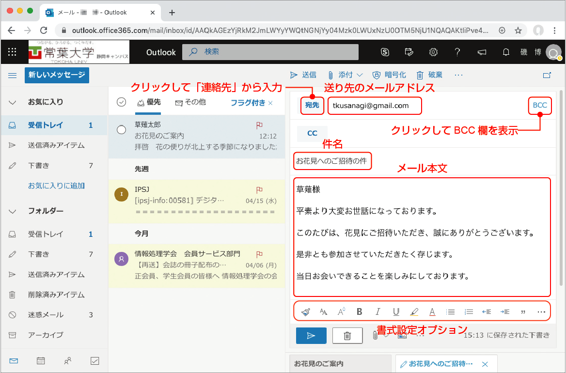 - 編集して送信するには、「下書き」フォルダから編集したい下書きを選び、内容を編集して「送信」ボタンをクリックします。送信された下書きは、自動的に削除されます。