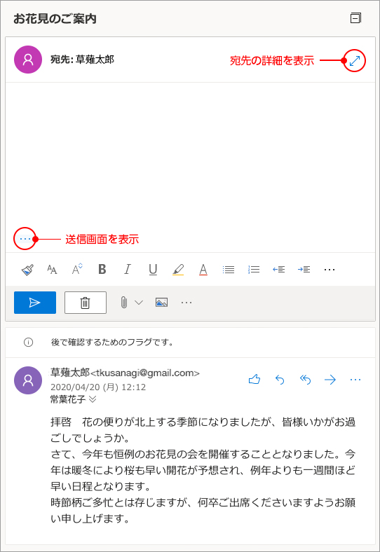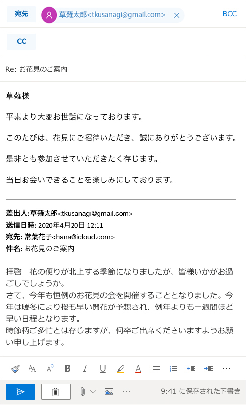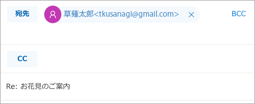 右上の斜め両矢印を押すと、宛先、CC、BCC、件名の詳細が表示されます。件名は、元のメールの件名の冒頭に「Re:」が追加されたものになります。