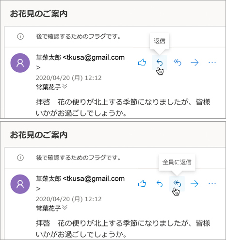 「返信」ボタンをクリックした場合は送信者に返信されます。