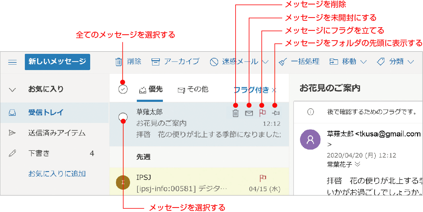 メッセージ一覧のメールメッセージにマウスを重ねると、上部右側にボタンが表示され、ボタンを押すことで、メールメッセージを削除したり、未開封にしたり、フラグを立てたりすることができます。