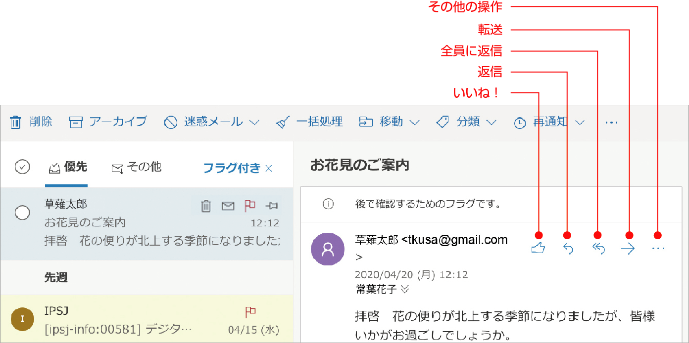 閲覧ウィンドウに表示されたメールメッセージの内容の一番上には、送り主の名前とメールアドレスが表示されています。その右側にあるボタンで、そのメールメッセージに対して、返信や転送などを行うことができます。