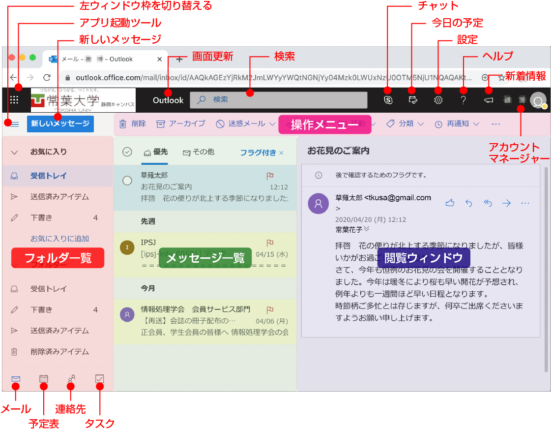 次は、メールを選択した場合のOutlookの画面です。Outlookの画面は、左から「フォルダ一覧」「メッセージ一覧」「閲覧ウィンドウ」に分かれています。