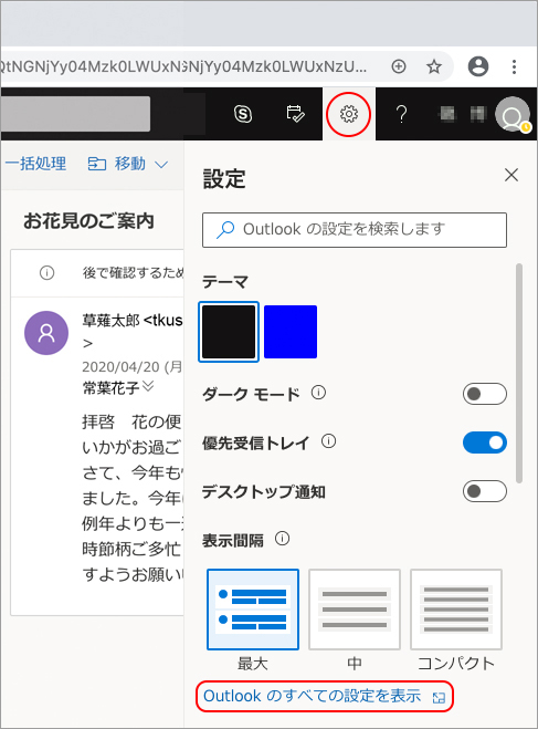 をクリックし、下にある「Outlookのすべての設定を表示する」をクリックします。