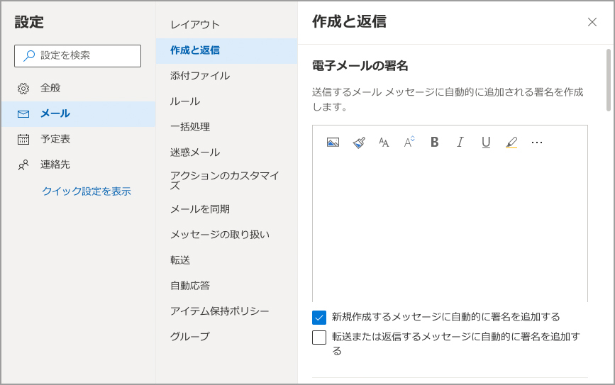 「設定」画面が表示されるので、左から「メール」を選び、「作成と返信」を選びます。すると、最初に「電子メールの署名」が表示されます。