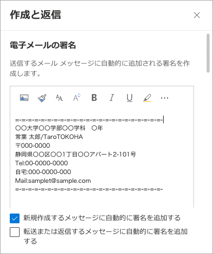 以上で、署名の設定は終了です。新しいメッセージを作成すると、下図のように署名が自動的に挿入されます。
