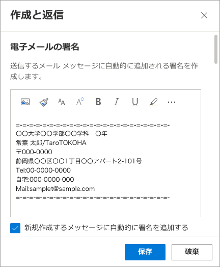署名を変更すると、下に「保存」と「破棄」のボタンが表示されますので、「保存」を選びます。