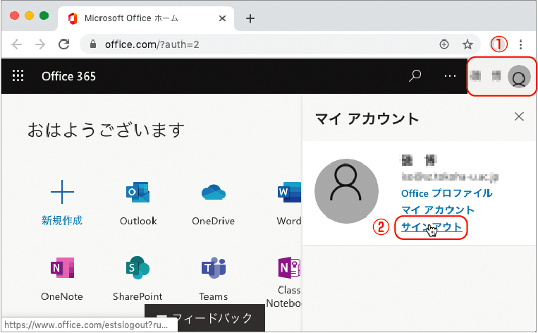 画面右上にある「ユーザ名とユーザの写真(人のマーク)」の部分をクリックし、表示されるメニューから「サインアウト」を選びます。